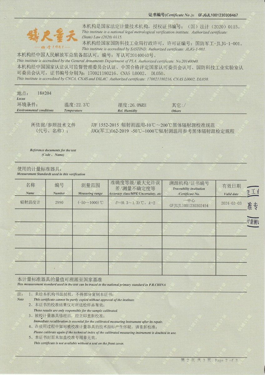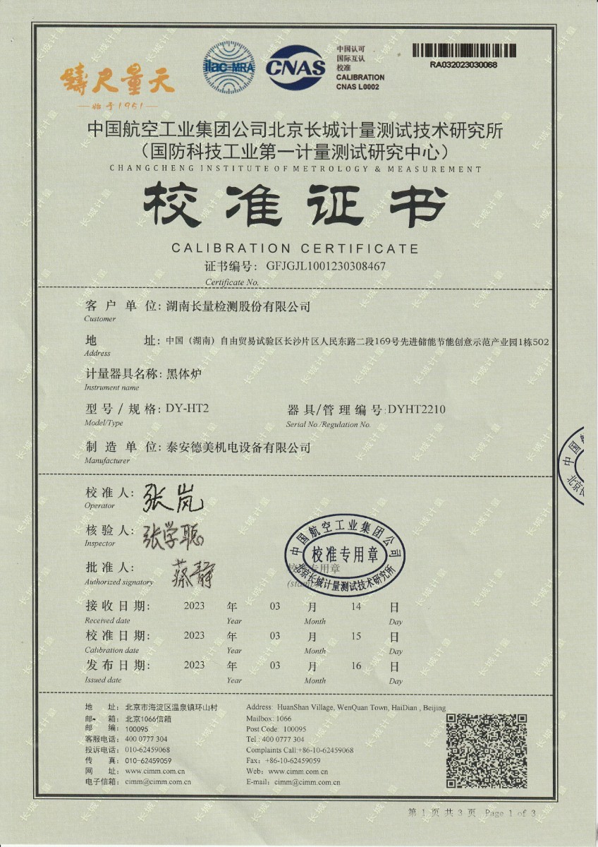 湖南長(zhǎng)量檢測(cè)股份有限公司 黑體爐 校準(zhǔn)證書 2023-3-31 本文被閱讀 13101 次