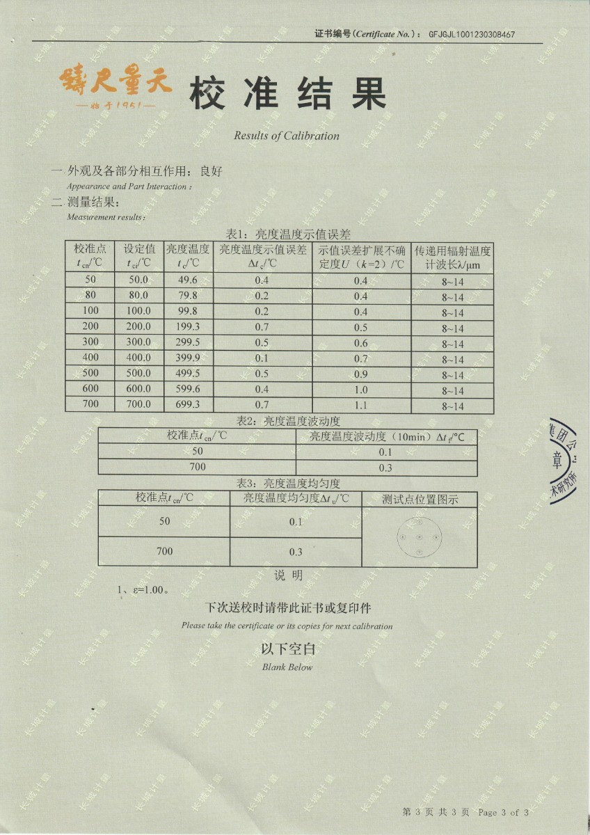湖南長(zhǎng)量檢測(cè)股份有限公司 黑體爐 校準(zhǔn)證書