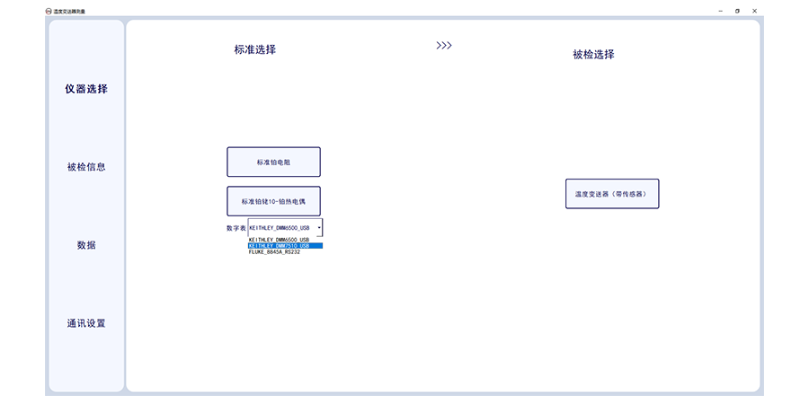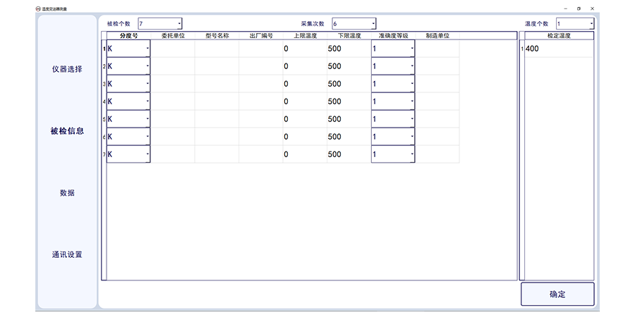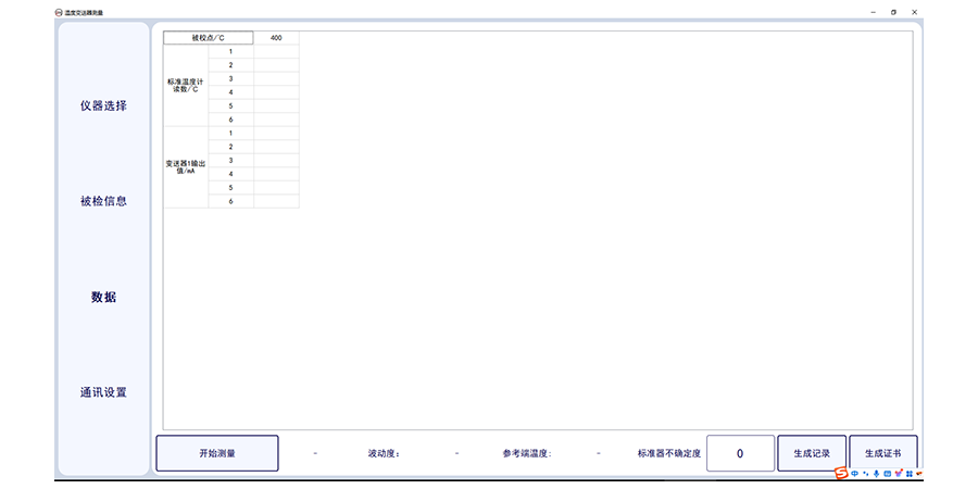 溫度變送器計量校準上位機軟件,此軟件適合溫度變送器的輸出電流采集,軟件需要溫度變送器(帶傳感器)配套標準器、恒溫設備及相應數字萬用表。軟件可選擇多個被檢傳感器,可設置采集次數,及溫度個數及溫度點。軟件可輸入委托單位,型號名稱出廠編號及準確度等級及制造單位。