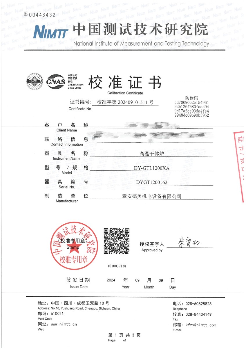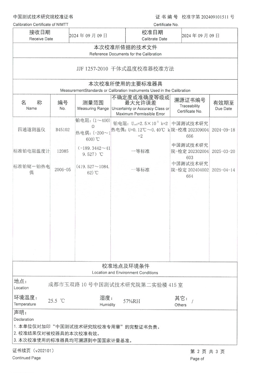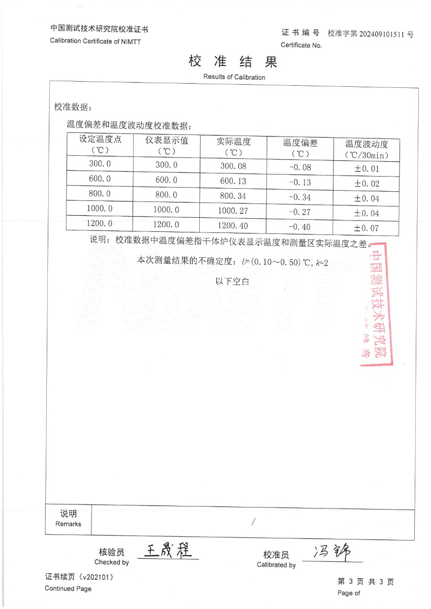 高溫干體爐(300~1200℃)校準證書 2024-9-11 本文被閱讀 7172 次