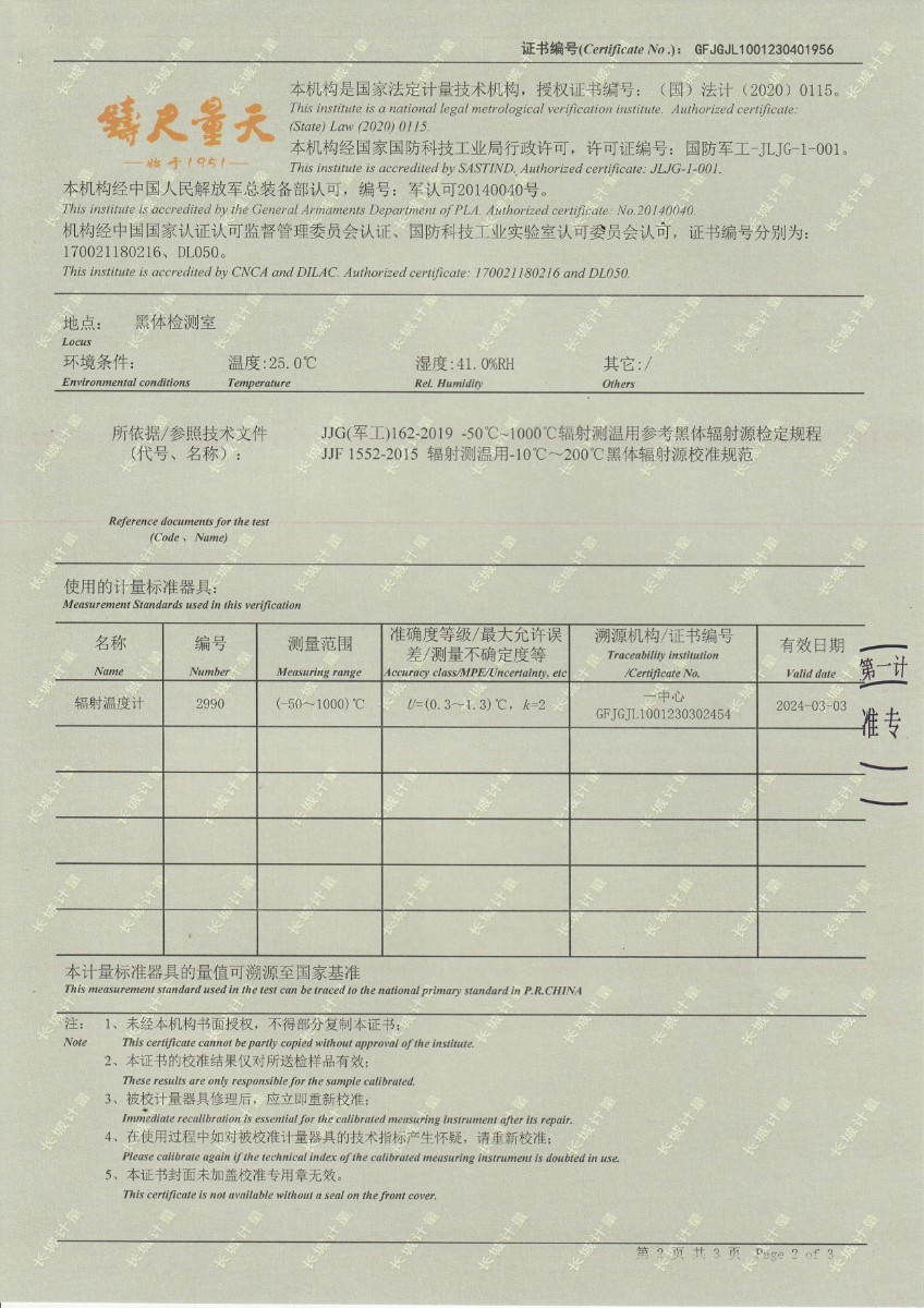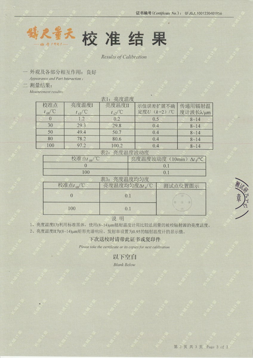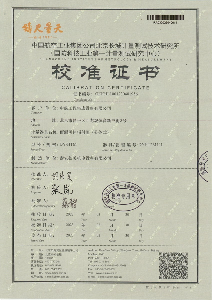 中航工程集成設備有限公司 面源黑體輻射源(分體式) 校準證書 2023-5-4 本文被閱讀 14490 次