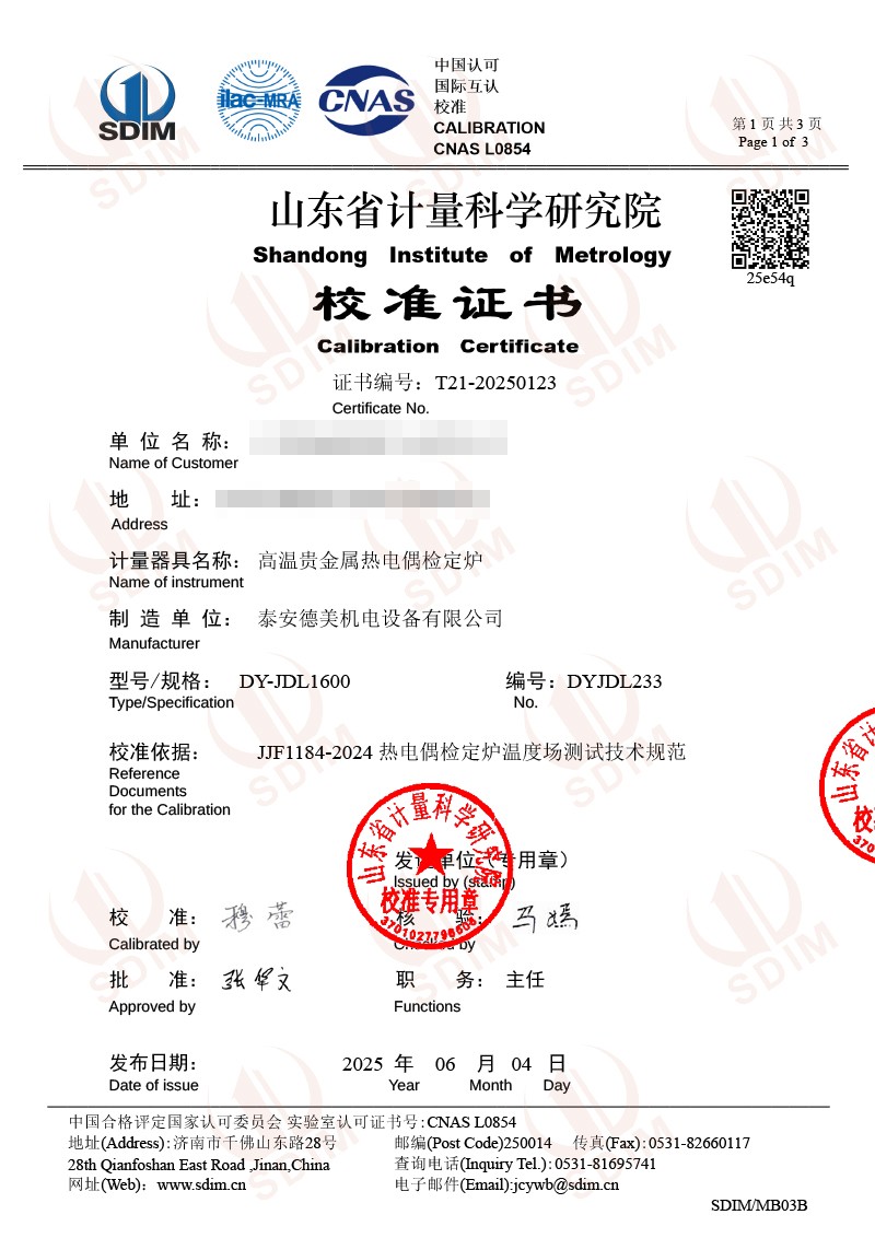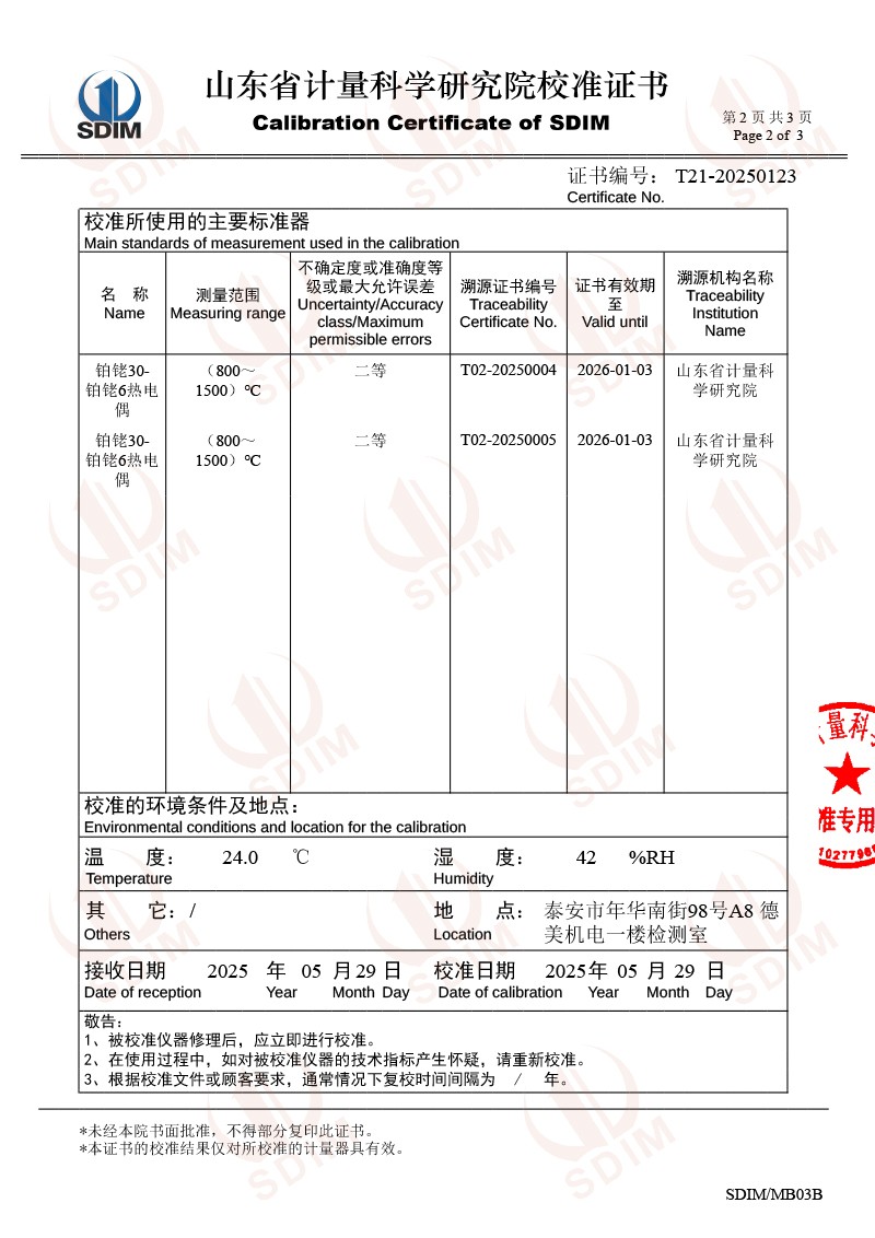 高溫貴金屬熱電偶檢定爐(800-1600℃)校準證書 2025-6-5 本文被閱讀 4028 次