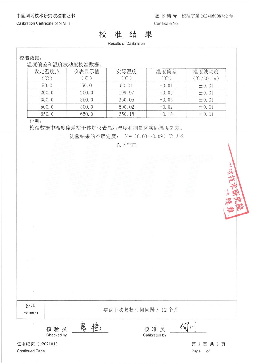 中溫干體爐296(50~650℃)校準證書 2024-7-6 本文被閱讀 7187 次