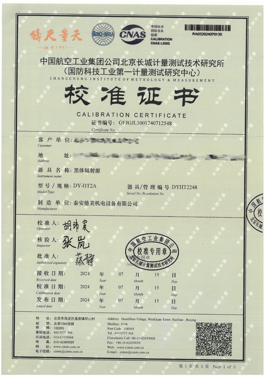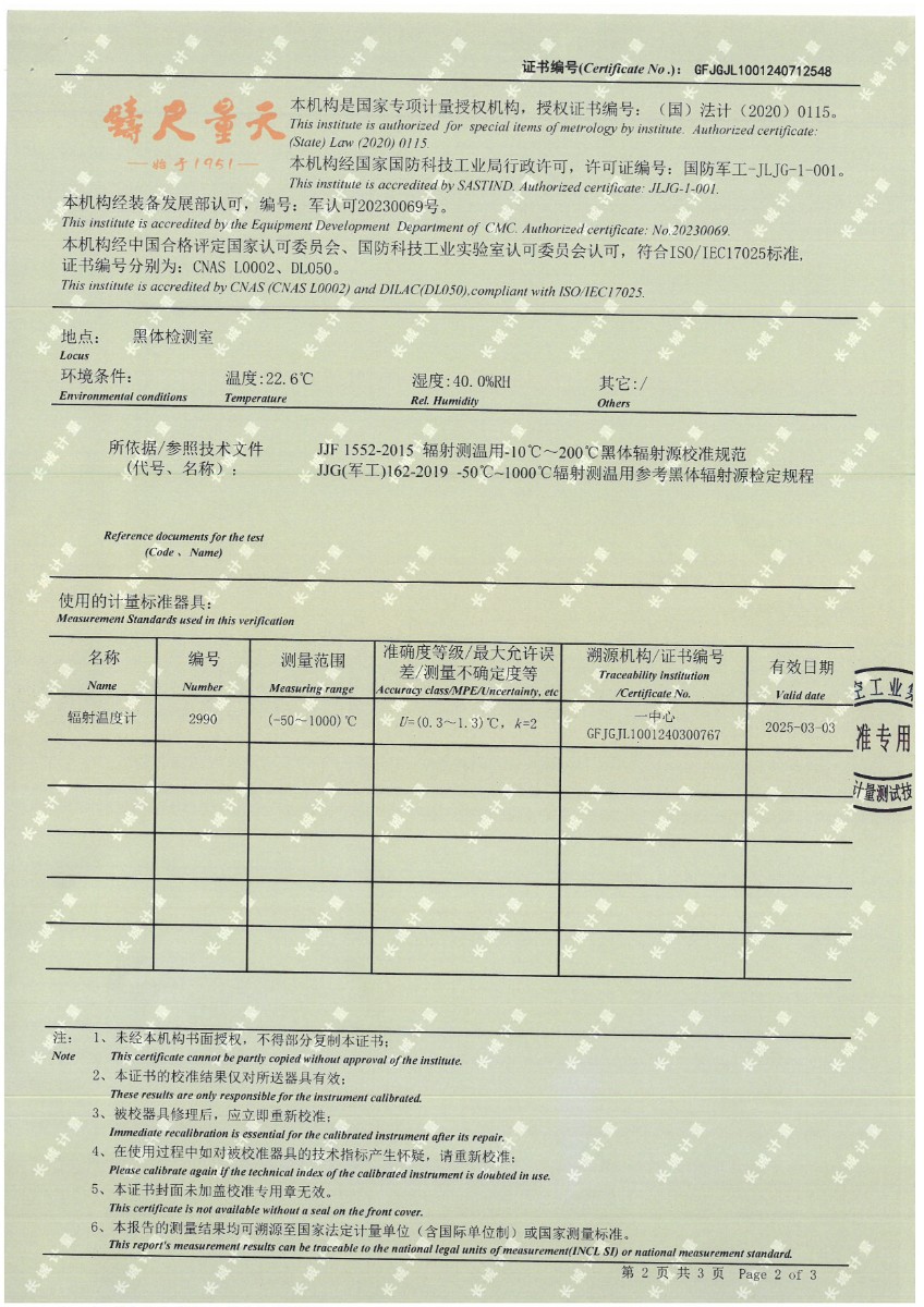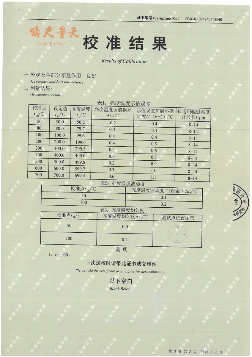 黑體(50~700℃)校準(zhǔn)證書 2024-7-29 本文被閱讀 11337 次
