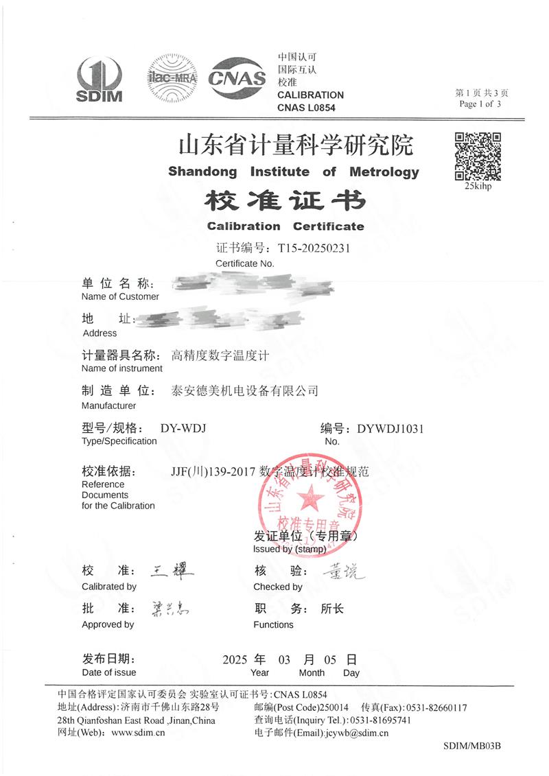 高精度數(shù)字溫度計校準(zhǔn)證書 2025-3-8 本文被閱讀 4153 次