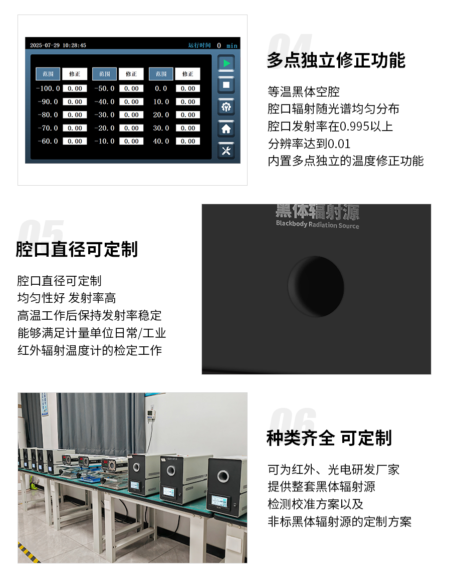 5)等溫黑體空腔,只一個(gè)腔口,腔口輻射隨光譜均勻分布,腔口發(fā)射率在0.995以上,分辨率達(dá)到0.01;