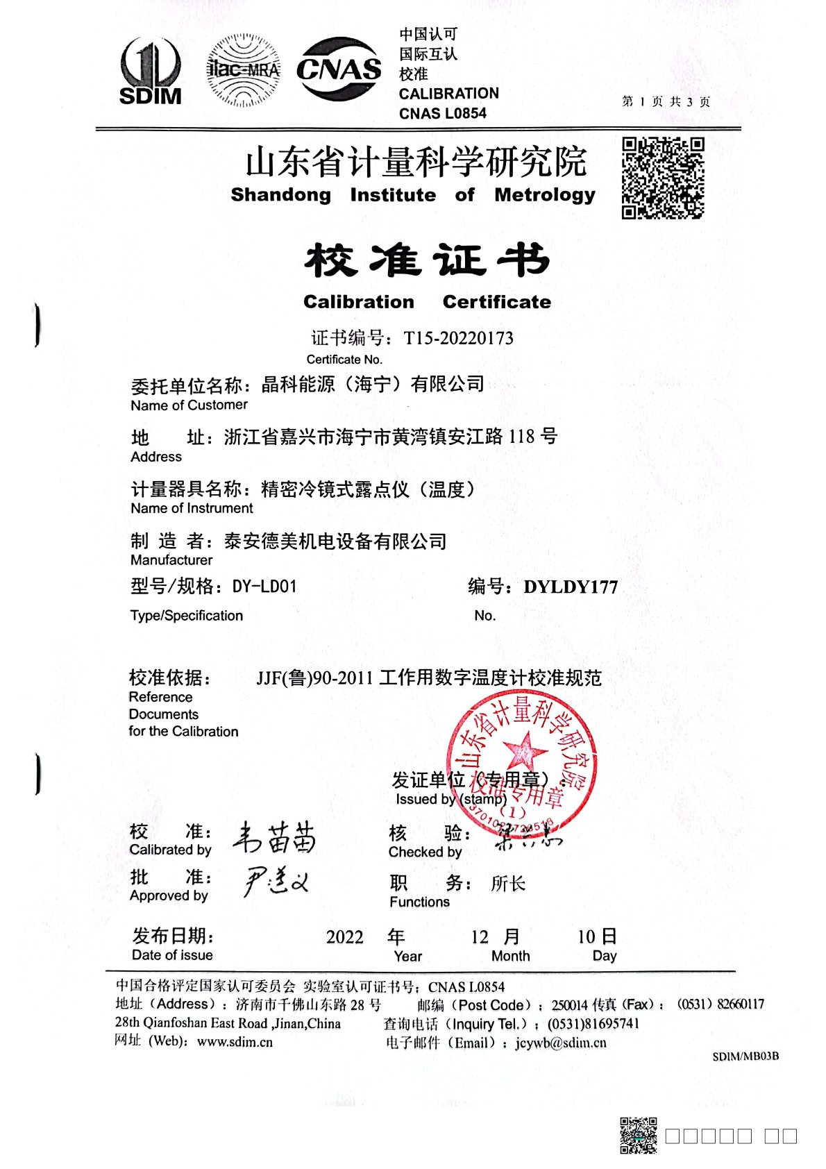 | 上一條:晶科能源(海寧)有限公司 精密冷鏡式露點(diǎn)儀 檢定證書 | 下一條:廉金屬熱電偶檢定爐-校準(zhǔn)證書 |