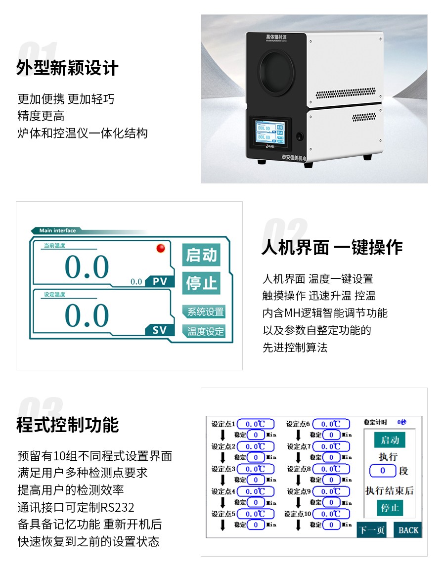 標(biāo)準(zhǔn)黑體作為標(biāo)準(zhǔn)輻射源,主要用于校準(zhǔn)輻射溫度計(jì)、紅外溫度計(jì)和輻射溫度傳感探測(cè)器。我公司目前具有先進(jìn)的黑體技術(shù),產(chǎn)品種類(lèi)全、溫度范圍寬的黑體系列產(chǎn)品。產(chǎn)品體積小、重量輕、便于攜帶,不僅適合各級(jí)計(jì)量機(jī)構(gòu)實(shí)驗(yàn)室校準(zhǔn)輻射溫度計(jì)使用,同時(shí)可以用于現(xiàn)場(chǎng)校準(zhǔn)。