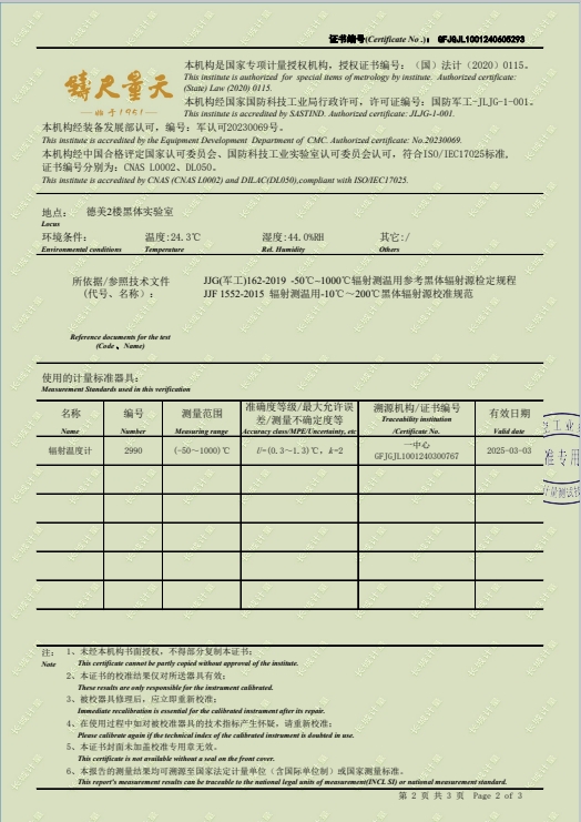 黑體輻射源(50-700℃)304所校準(zhǔn)證書