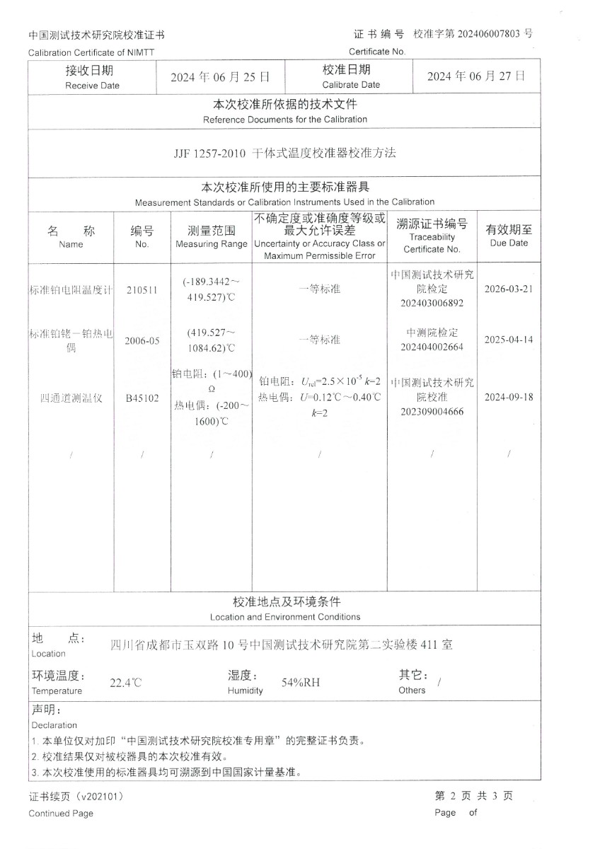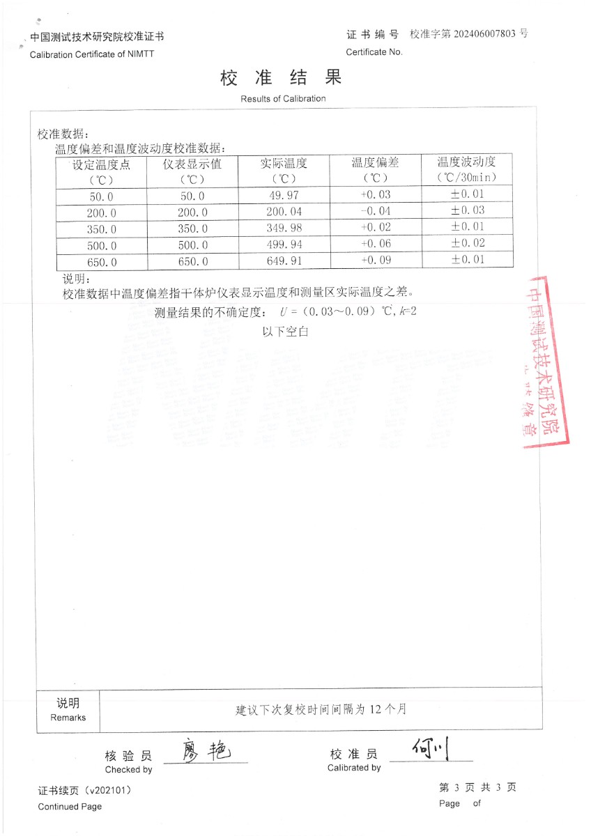 中溫干體爐(50~650℃)校準(zhǔn)證書 2024-7-1 本文被閱讀 6954 次