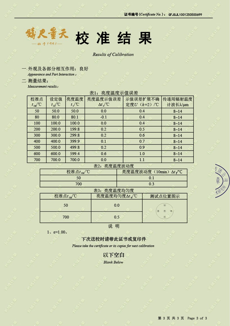 腔式黑體輻射源(50-700℃)校準(zhǔn)證書 2025-5-9 本文被閱讀 3836 次