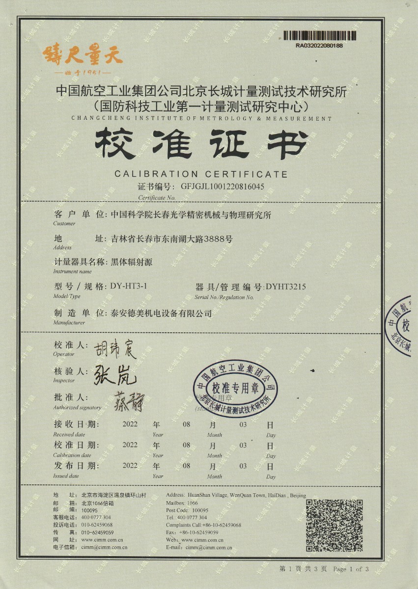 中國科學院長春光學精密機械與物理研究所-黑體爐DY-HT3-1 2022-9-5 本文被閱讀 13365 次